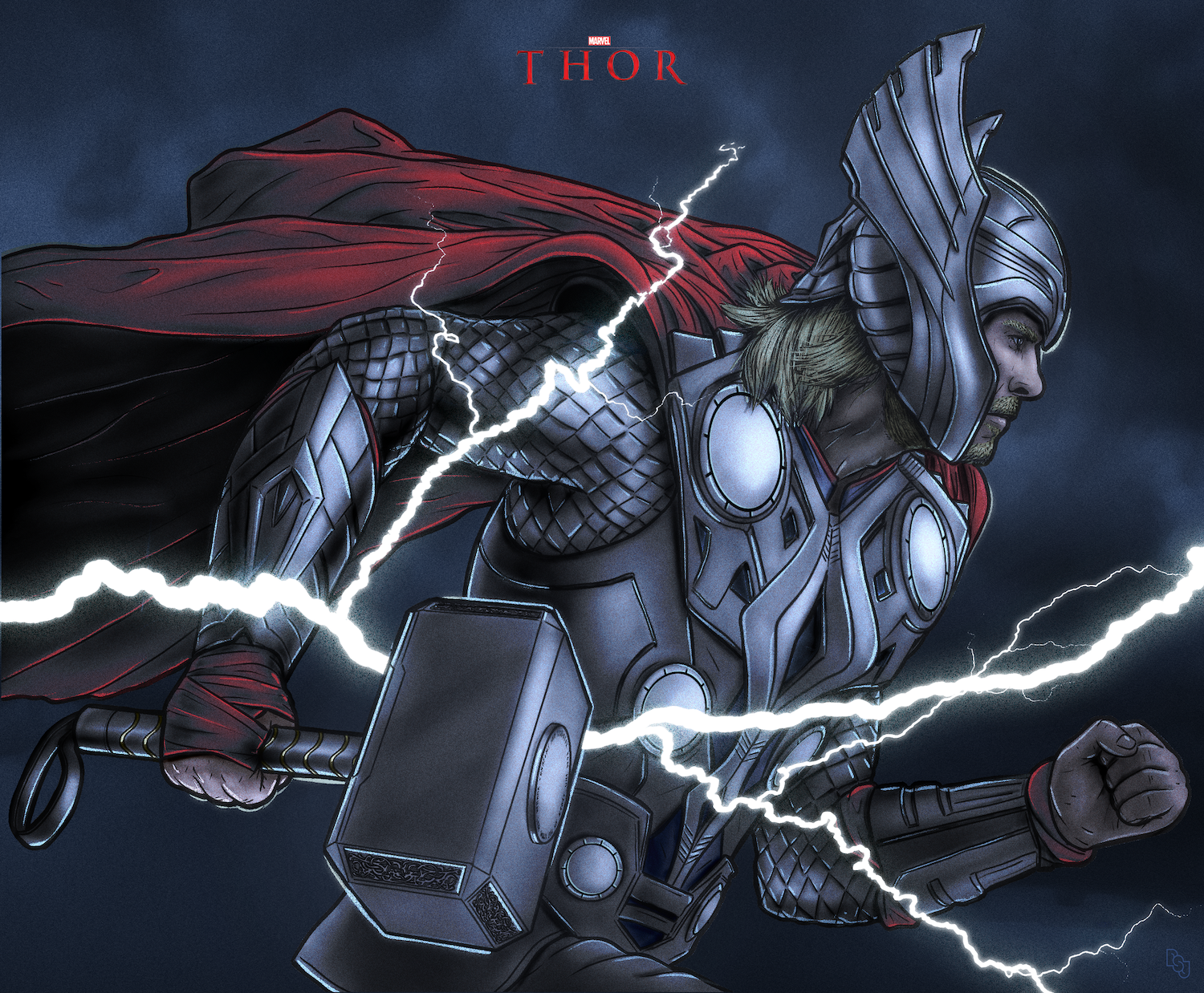 When Marvel's Thor: Love and Thunder came out in 2022, I wanted take the opportunity to illustrate a piece of fan art in celebration of the Mightiest Avenger's fourth (and maybe final?) solo outing. The original caricature I completed (pictured in the process images below) was less than I'd hoped for, so I naturally overcompensated by trying to design a piece that was objectively rad as possible. The result was this landscape poster featuring Chris Hemsworth's God of Thunder in all his glory.